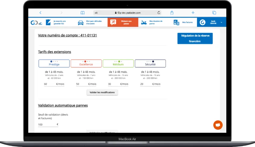 Vos propres extensions de garanties sont configurées pour un enregistrement et une édition automatique avec votre bon de commande. Notre logiciel F2G enregiste et édite automatiquement l’opération sans avoir à revenir sur notre application pour inscrire le contrat.
